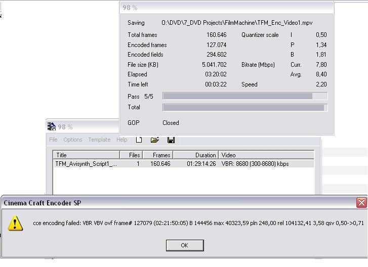 The only good results were with The Film Machine. The converting progress went fine but before the dvd authoring and vob creation started, it shut down. I checked out the files it created and it was a