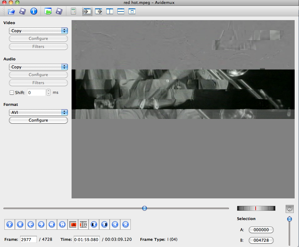I've been too enthousiastic about Avidemux. Like I mentioned earlier, Avidemux helps me to convert the few VOB's I can't convert using MPEG Streamclip. But editing these problematic VOB's (before converting them to MPEG) is another cup of tea. After opening these VOB's in Avidemux I get a scrambled picture. This way it's hard to navigate to the parts of the video where you want to cut. Also there's no audio.