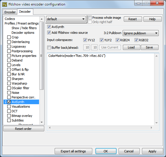 I usually use an obvious filter like Invert() when figuring out how to get an application to use ffdshow.