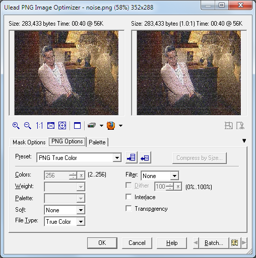 Both are lossless PNG images. The first is 352x288 pixels and the file size is 287 KB. The second is 1920x1080 but the PNG file is only 80 KB.Last edited by jagabo; 11th Aug 2011 at 17:10.