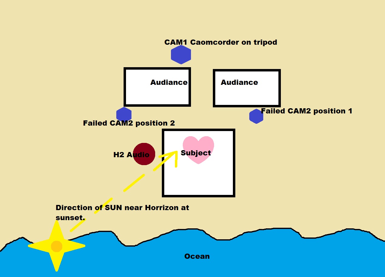 The original plan for a 2 camera shoot with the Canon in the back with a wide shot on a tripod. I was going to get in close with the Nikon (camera 2). It was a beach wedding and my Nikon lens fogged up, on the inside and became useless. I had no other lens and limited spare gear because I was also in charge of my 2, 8, and 9 year old kids (the three reasons I was late). My wife was in the wedding party. I was smart enough to stash my Zoom H2 recorder next to the action or I would have had no usable audio. So I have a 1 camera shot and some OK audio.