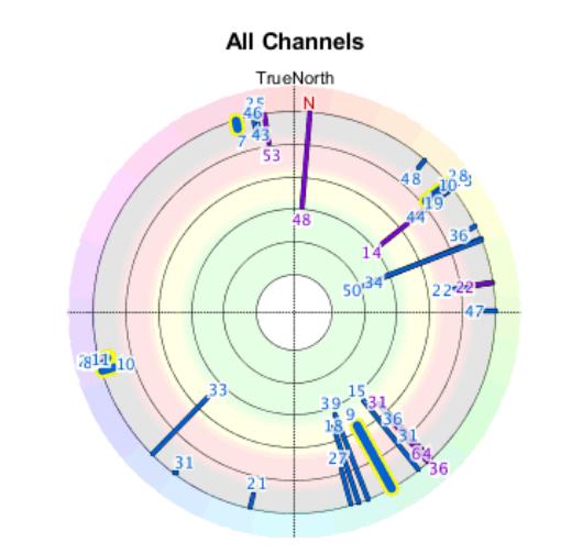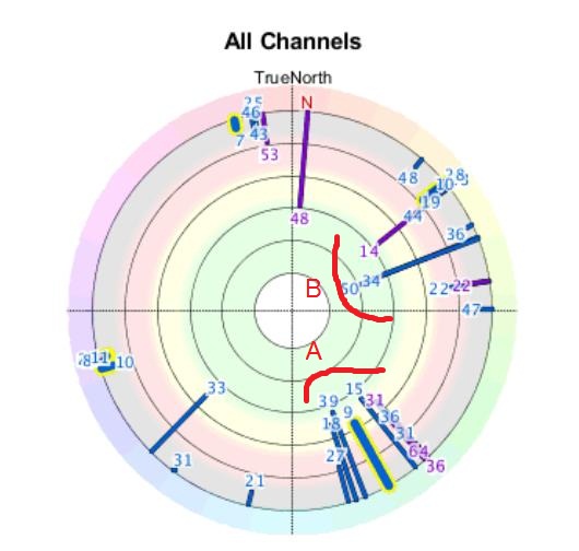Direction A will be easiest (other than ch9). The stations are grouped and the signals are stronger. Direction B has two strong stations. The rest look weak. The list view will help me predict which will come in.