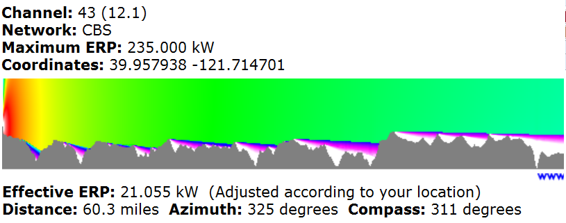 Mountains and ridges here too. 1Edge and 2Edge paths are tricky. You are grabbing spill signal that bends over hills and ridges. TV Fool has a nice feature few know about. If you click on the call letters, TV Fool will plot a signal path to your location showing the terrain between you and the selected transmitter. This is the path of my best network station. This station usually comes in but others come and go seasonally and by time of day. Antenna pointing needs to be +/- 2 degrees or it goes away.