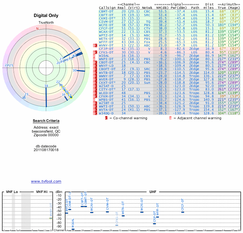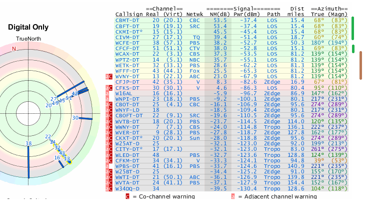 Thanks for helping, an indoors rabbit ears gave me ONLY the first channel on the TVfool plot, CBC.