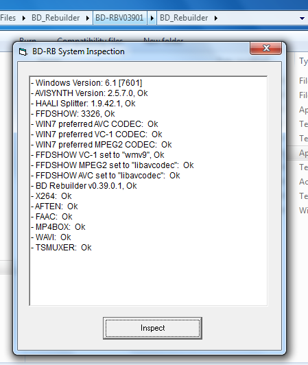 - Windows Version: 6.1 [7601] - AVISYNTH Version: 2.5.8.0, Ok - HAALI Splitter: Isn't recommended version - FFDSHOW: 3882, Ok - WIN7 preferred AVC CODEC: Ok - WIN7 preferred VC-1 CODEC: Ok - WIN7 preferred MPEG2 CODEC: Ok - FFDSHOW VC-1 set to "wmv9", Ok - FFDSHOW MPEG2 set to "libavcodec": Ok - FFDSHOW AVC set to "ffmpeg-mt": Ok - BD Rebuilder v0.38.0.9, Ok - X264: Ok - AFTEN: Ok - FAAC: Ok - MP4BOX: Ok - WAVI: Ok - TSMUXER: Ok