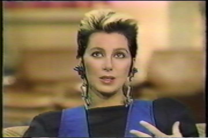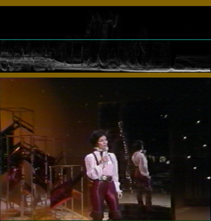Another problem is frequent discoloration, and "flashes" of off-color. The image below is frame 398. The red background behind Cher has gone green. The cap below this frame shows frames 398 (green) and 457 (pink). The bad colors appear mostly in even fields, not so much in odd fields, and often both. If you use SeparateFields and then StackHorizontal(even,odd) to see the fields next to each other, you'll see that any chroma cleaning will have to work on separate fields.