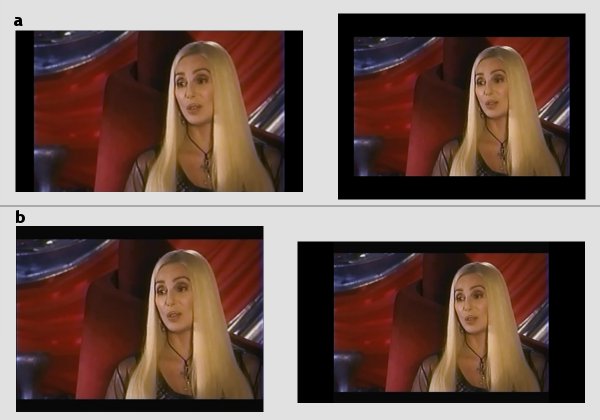 - letterbox bars removed and formatted to 16:9 (a), and to the right how it would look on a 4:3 display