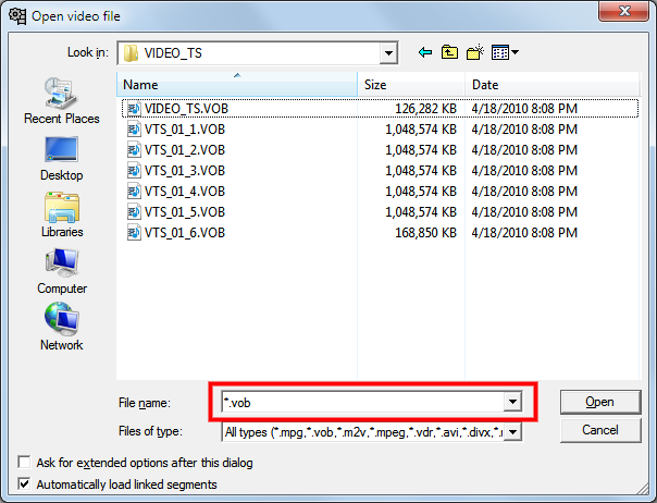 In the Import/Open dialog box, there's the line for filename, but is there a line for file TYPE? If so, it should have a drop-down that allows you to choose VOBs from among the list.