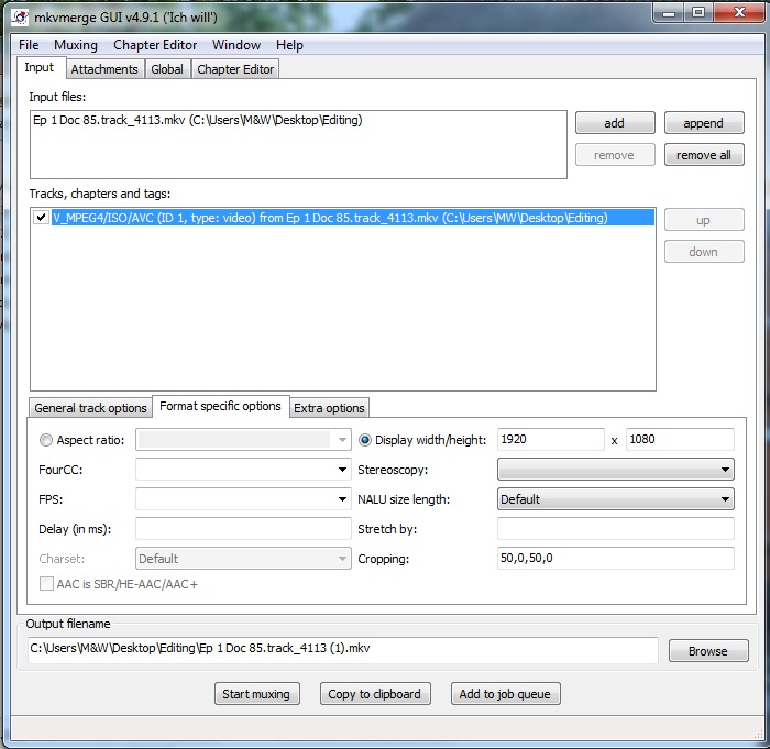 then i put the original MKV (with AC3 audo track) and the new cropped MKV in mkvmergeGui, un-ticked the original video track, set the fps on video (or audio?!?) to 23.976 fps and clicked the MUX button..