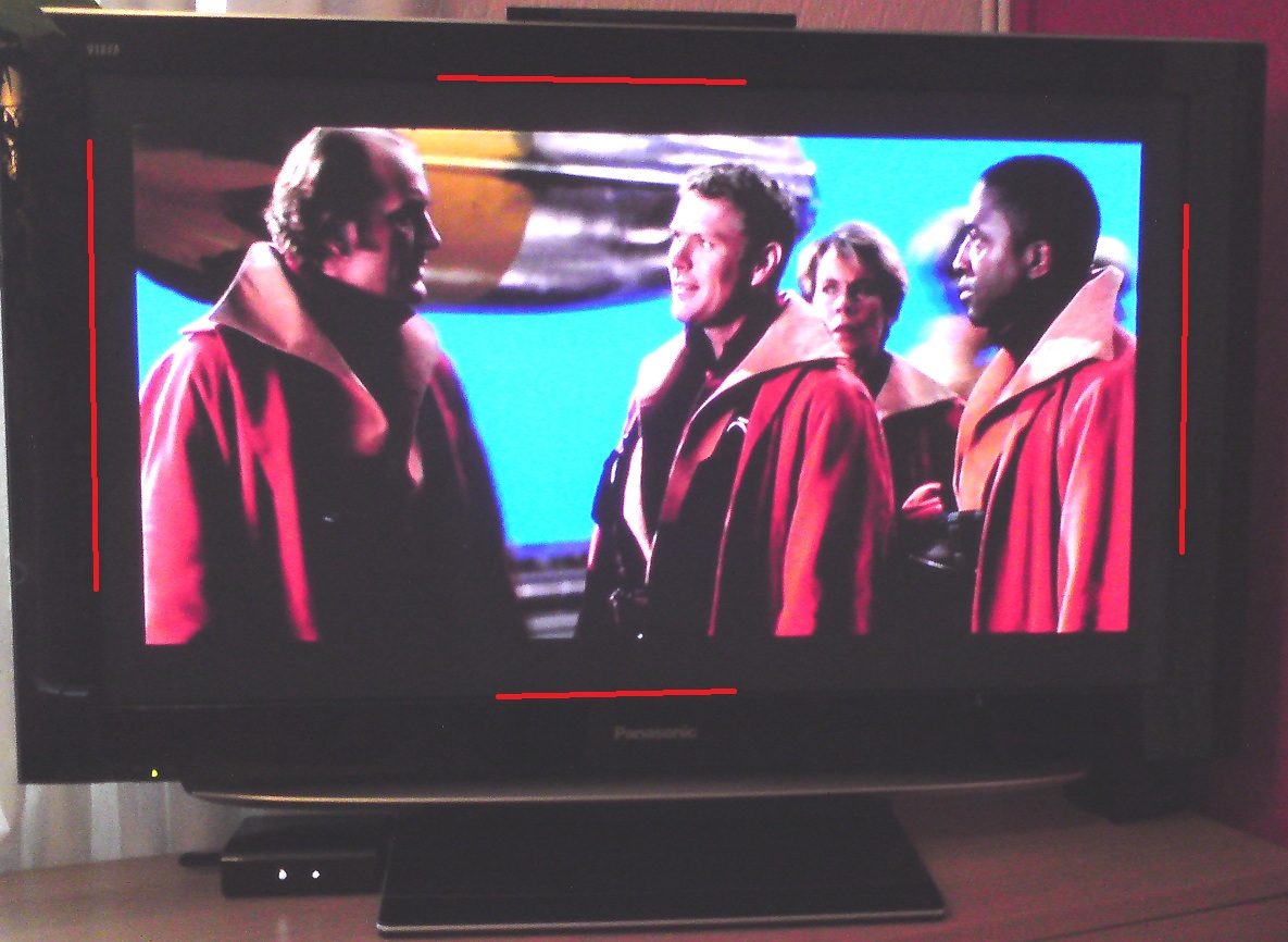 I have marked out where the tv edges are.. as you can see, it hasn't quite worked as planned. i thought by chopping of some of the edges the TV would automaticaly pull the picture closer and thus losing the black bars at the top. -