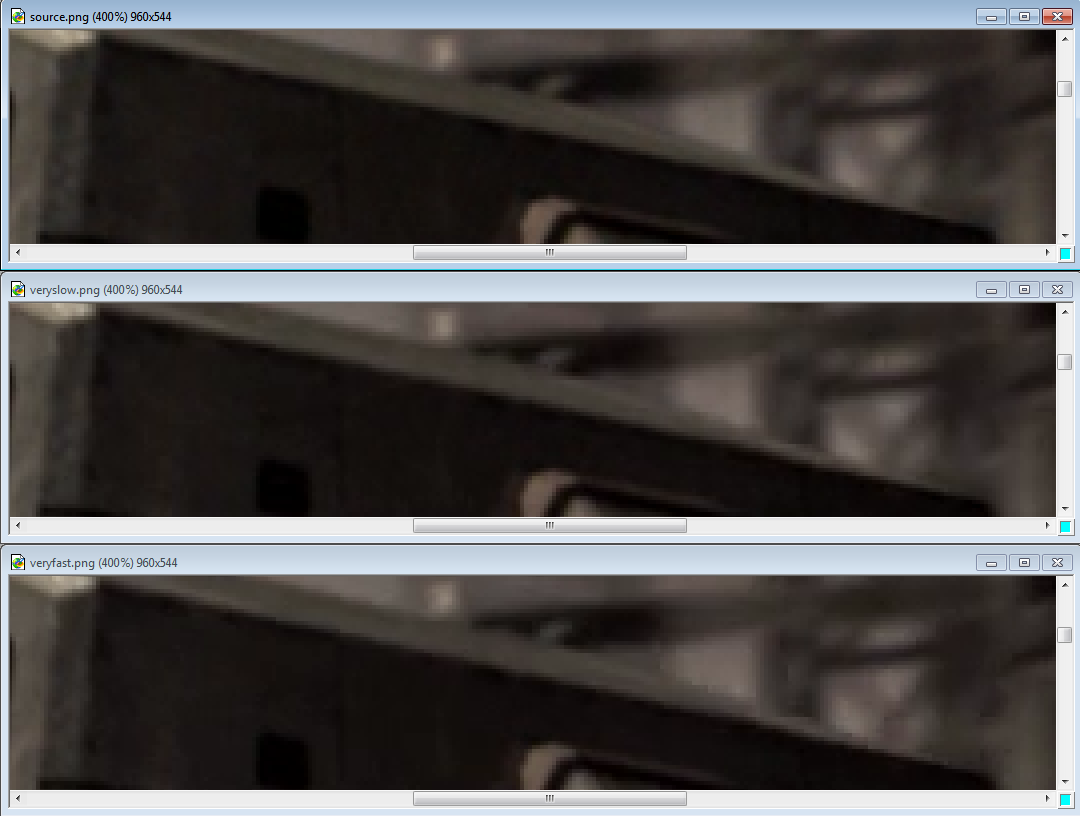 If you look at the line between the dark front edge of the ship and the lighter top edge you can see it's very smooth in the original frame. It's a little rough in the veryslow sample, and even rougher in the veryfast sample. There's also less fine grain detail on the dark front of the veryfast sample. Be sure to examine the above image at full size.