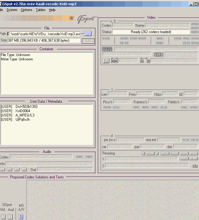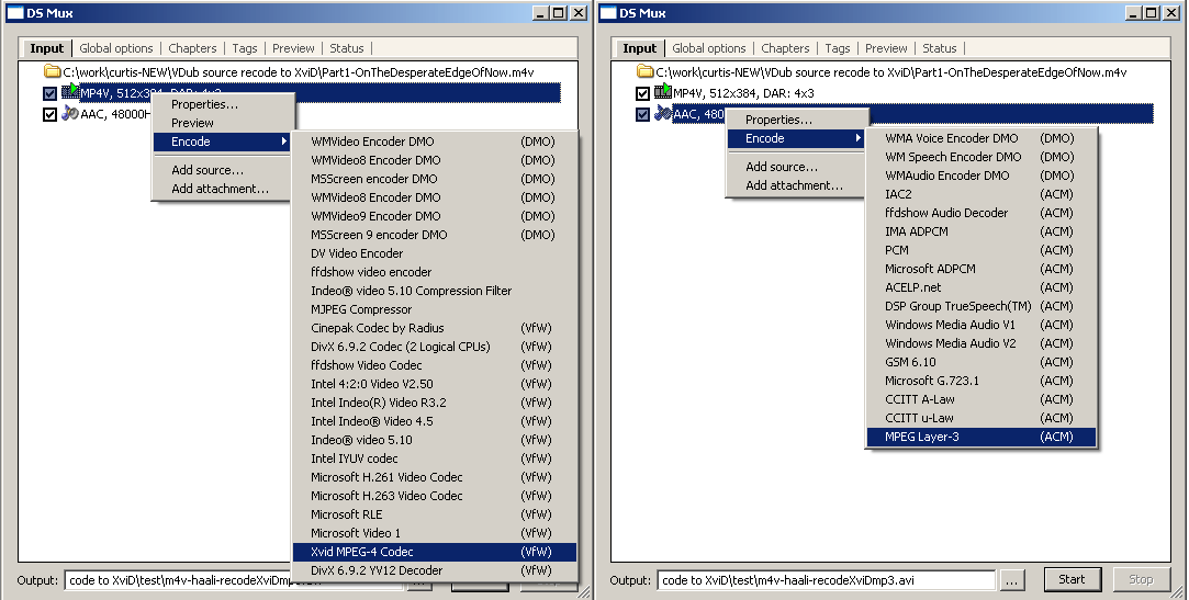 I also looked at a suggested alternative:Complete name : C:\work\curtis-NEW\VDub source recode to XviD\test\m4v-haali-recode-XviD-mp3.avi