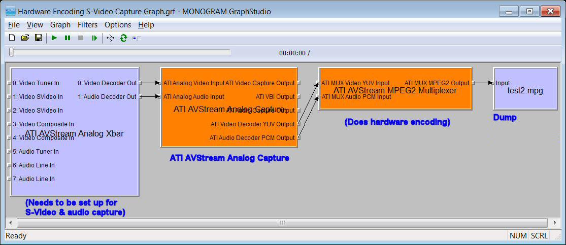 If you want to try edDV's suggestion of using a filter graph for capture to utilize your card's hardware MPEG-2 encoder, this is a screen capture of a filter graph I made some time ago using GraphStudio for the TV Wonder 650 PCI-e. ATI's filters can be found under Graph->Insert Filter in the WDM Streaming Capture section in the drop-down filters list. I think the Dump filter used is Moonlight DumpPOS which I think was installed along with with DVRMSToolbox. Just drag and drop the pins as shown and right-click on the filters to configure their settings