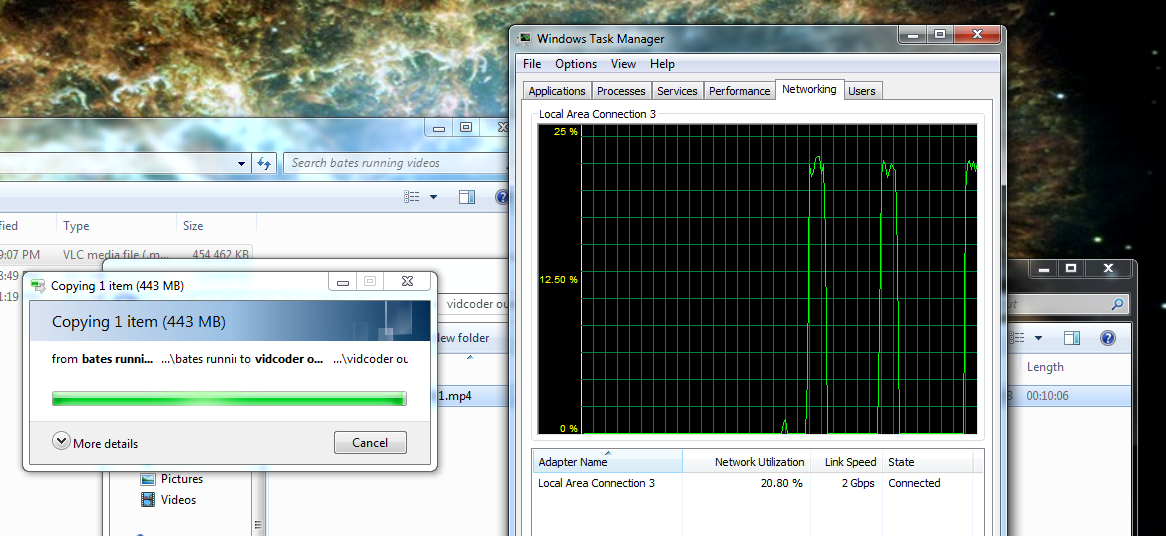 in the task manager. 20% of the 2Gbps connection is 400mbps or 50MBps. it took 3 tries to get the screenshot at the right time that's why there are 3 peaks.