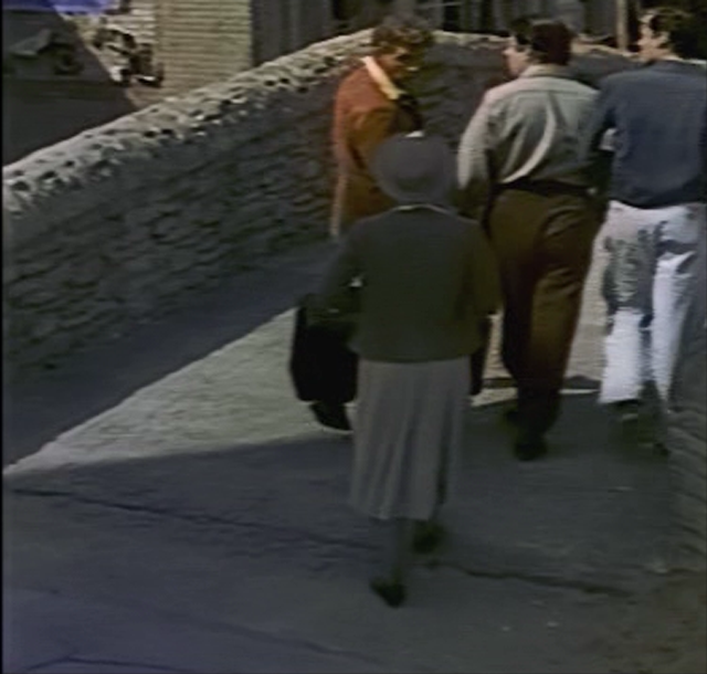 One scene with really ugly color problems. From various discussions I learn that these effects are caused by (a) lousy mastering for the VHS, WNET's digital broadcast, and TCM's digital Broadcast, (b) Macrovision effects, and (c) VHS that's been played to death. The scene starts green, then red and green and blue "pump" for several seconds. None of the colors look correct anyway: the girl's clothing is supposed to be dull gray, the purse and suitcase black, lighting is harsh early morning sun -- no telling what the colors of the buildings are, they look different in every shot.