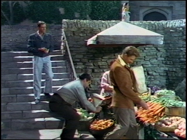 After much filtering, despotting (exactly the same spots, cherries, grapes, etc., are in the digital broadcasts), AutoLevels, SmoothLevels, ColorYUV, MCTemporalDenoise, QTGMC, and lord knows what else. This is the first several seconds of the scene in MPEG2. You can see why most "auto" controls don't work here. They make levels and color balance worse whenever anything moves.