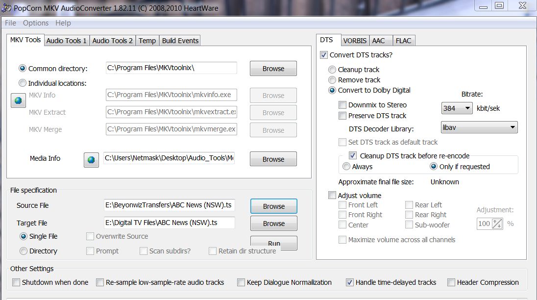 Now load this ouputted file (not the dts file on its own; thus no need to extract the audio) into popcorn and after you have selected your desired AC3 settings, just press run! That's all there is to it.