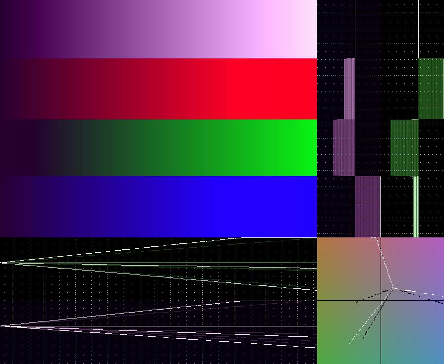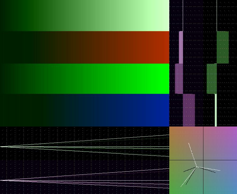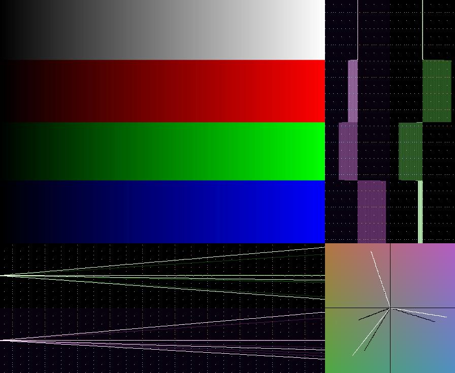 So increasing the contrast of of the luma signal results in darks getting darker and lights getting lighter. Increasing the contrast of the chroma signal increases color saturation. Increasing the gain of the luma results in all pixels getting brighter (except 0 which stays at 0). Increasing the gain of the chroma signals results in some weird color shift that I can't really fathom. Basically, positive values push toward purple, negative push toward green.