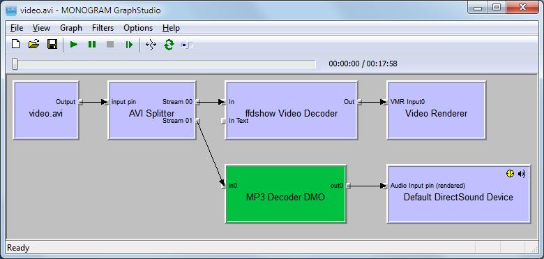 Playing a video in Windows involves building a filter graph -- piecing together several software components to open the file, split the audio and video into separate streams, decompress each of those streams, then send them to the appropriate output device (graphics card, sound card):