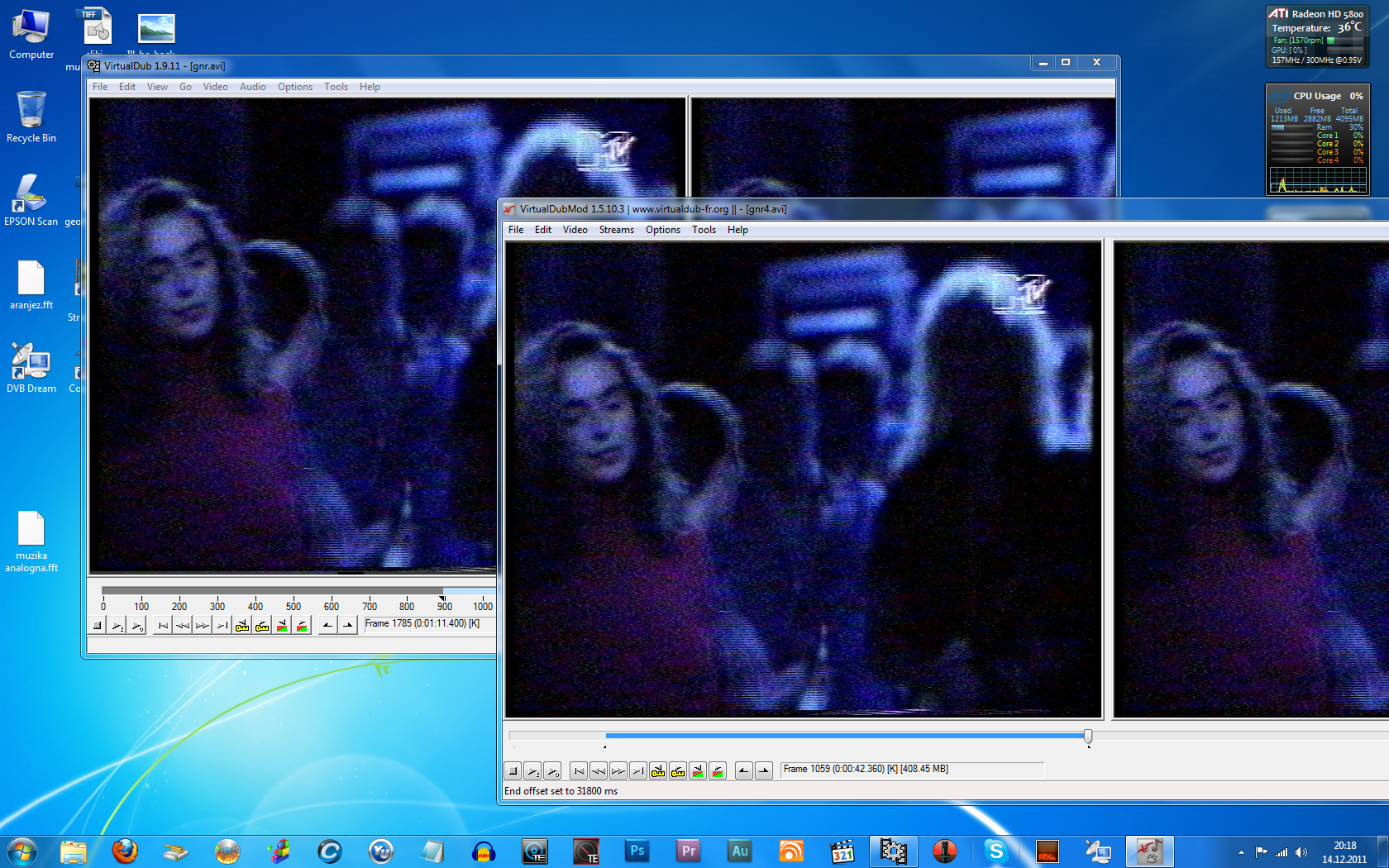 The easiest way is opening one instance of virtualdub and one of virtualdubmod put them side by side and by eye look for first frame to last ( at least thats how i do it ) compare source 1 to source 2 then source 1 to source 3 and so on. I think jagabo has some approach trough avysinth you can try that also. By the way i captured 5 times very noisier record from 1990 MTV channel with a lot of analog broadcast noise because of the reception so i will try how the median and blending approach will keep up with it.I captured in windows 7 intentionally that way i can't use the pc card proc amp controls (levels) in vdub while capturing so i get original from vhs tape. The source vcr ag1980 trough dvd recorder es15 to pc card pinnacle 110i. game booster on ( so it will help stop the interference from other programs while capturing ) Will it going to be irrelevant because the noise from the source is bigger than the noise from the equipment let seeLast edited by mammo1789; 14th Dec 2011 at 14:36.