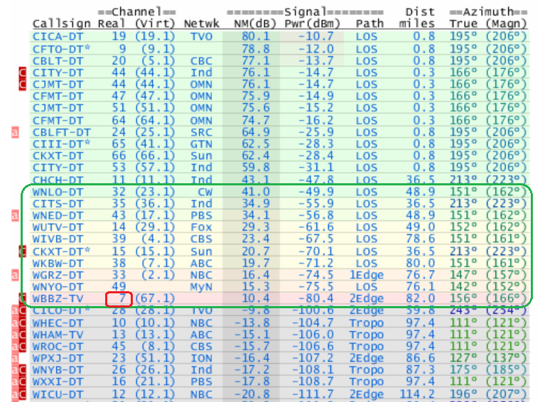 1. Directional Plot (digital channels) You can see here that the USA transmitters of interest are grouped at 151 degrees south near Buffalo. There is a second grouping of more distant transmitters near Rochester.