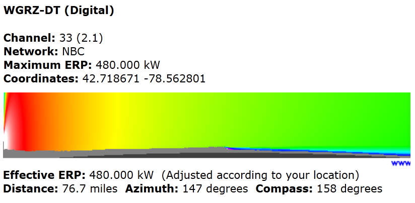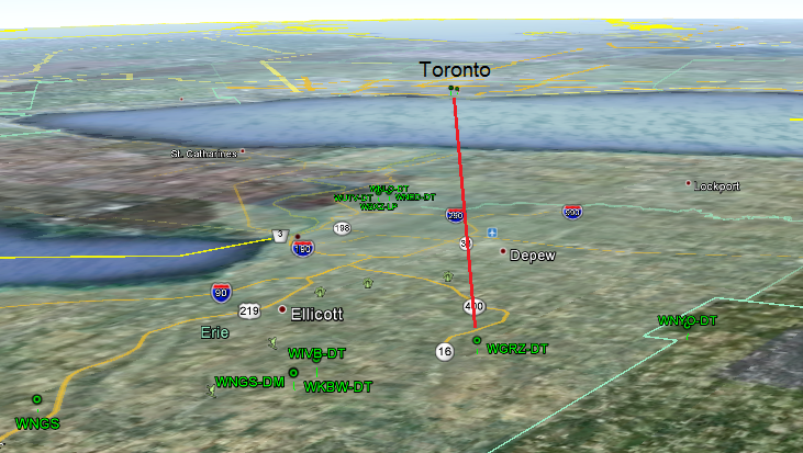 2. Transmitter Location. It isn't enough to point an antenna at a city. Most TV station transmitters are not located in town, but on the highest hills/mountains outside town. This is very important for distant reception because the curvature of the earth comes into play at about 60 miles. The way to peak above the horizon is to raise the height of the transmitting or receiving antenna. For this reason, the Buffalo TV stations locate their transmitters southeast of the city on the highest land even though it increases the distance to Toronto (79 to 82 miles).