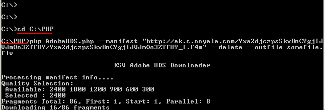C:\PHP>php AdobeHDS.php --manifest "http://ak.c.ooyala.com/Yxa2djczpsSkxBnCYgjIJ