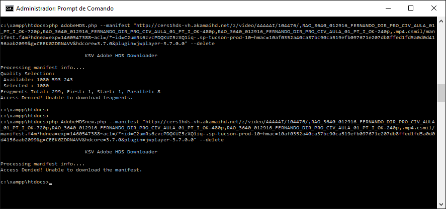 Somebody can help me please?Code:php AdobeHDS.php --manifest "http://cers1hds-vh.akamaihd.net/z/video/AAAAAI/104476/,RAO_3640_012916_FERNANDO_DIR_PRO_CIV_AULA_01_PT_I_OK-720p,RAO_3640_012916_FERNANDO_DIR_PRO_CIV_AULA_01_PT_I_OK-480p,RAO_3640_012916_FERNANDO_DIR_PRO_CIV_AULA_01_PT_I_OK-240p,.mp4.csmil/manifest.f4m?hdnea=exp=1460547388~acl=/*~id=C2umRs6zvcPDQKUZ5zXQ1iq-.sp-tucson-prod-10~hmac=10af0352a40ca37bc90ca519efb097671e207db8ffed1fd5a0d0d4156aab2099&g=CEEKGZDRNAVV&hdcore=3.7.0&plugin=jwplayer-3.7.0.0" --delete