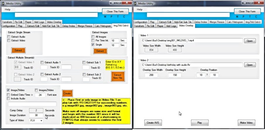 The second string uses the MP4 (JPG image 30 seconds long) and overlays it with the movie (birthday with audio.flv), scaled to 200X150 and placed at overlay position 0:0 and creates the final MP4(img001_IMG2VID_1_OVRLY_2.mp4) -