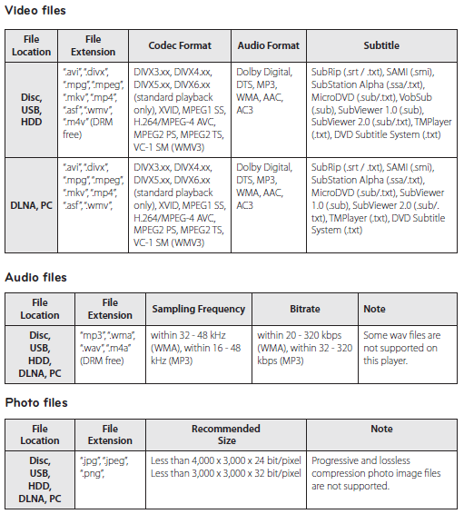 For example, the LG_BD690 lists the following. They don't state resolution, bit rate or other limitations (expect many). Strange there is no mention of transport stream containers (ts, m2t, m2ts, mts) or program streams (VOB, ps). Taken literally, this eliminates most camcorder and DTV capture files unless they are re-muxed to a supported container.