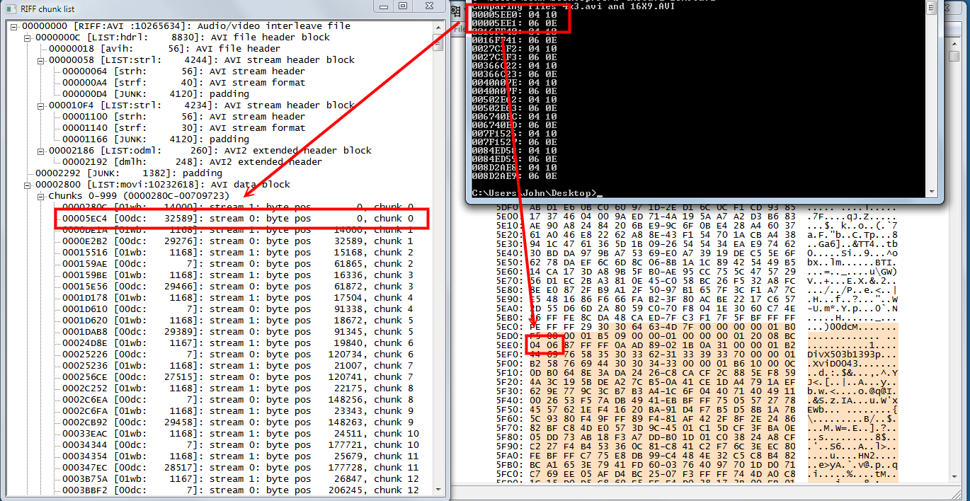 i have two vdub hex window opened on two clips..the clips being 16x9 and 4x3 encoded. i'm going cross-eyed looking at it. impossible to find difference this way. next i'll re-encode the two clips to something much smaller size,like 30 frame or less. i only need to see internal details, not video quality/playback. so the only alternative is to custom write something for doing this.