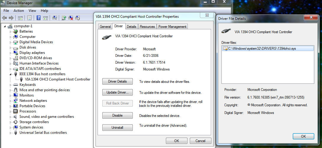 If the mobo has a VIA chipset, like the one shown below, the VIA 4-in-one driver installs the IEEE-1394 driver and it shows like this. You need to install your mobo drivers.