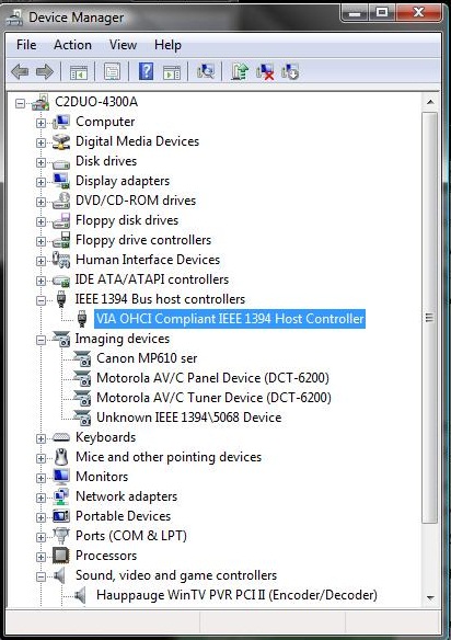 So, if the firewire sockets, plugs, cable and electronics are OK than the video source should appear in any video capture software. Thus far, I only suffered hopeless attempts to my firewire cards work. Amazing that so many other people have similar problems. too.