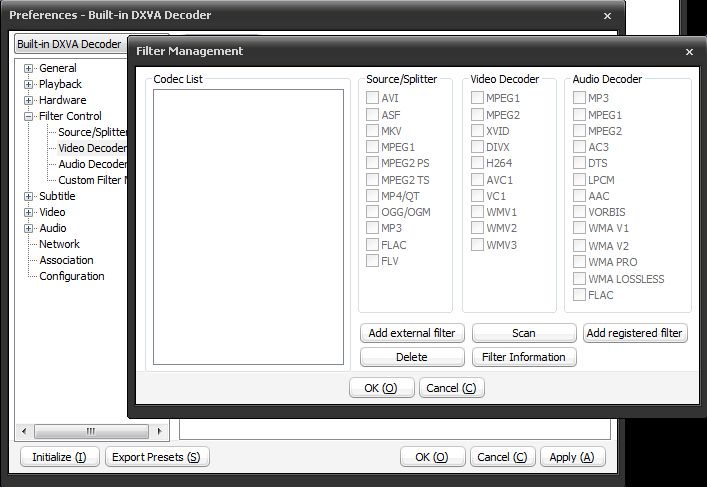 Under Filter Control/Video Decoder/Filter Management a window appears that lets you add or delete filters on your system. I've "scanned' and it shows LAV Filters and Haali etc. I've ticked boxes under Video Decoder/MPEG2 set up with LAV and Haali and zero subs show. Go back to Built-in and subs show...but won't go away.