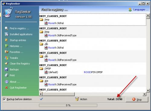 Regseeker works by typing in the name of the program in the searchbox that the installer used. Then click "Search!" It will scan through your registry and pull up all entries that have that name in it, and the name is hi-lighted in blue. Wait until the Action progress box at the bottom reads "0". During the scan it will count up to 100%, but do nothing until it defaults back to "0", then it is finished. At times it will stop, and you think it has hung; it hasn't. Just wait. After completion, all entries in your registry will be displayed, with the name of the search word in blue. If you double-click on that entry, Regedit will launch and take you to the actual entry in your registry for further inspection or editing. Be sure "Backup before deletion" is enabled in lower left. To delete, click on the top entry, scroll down to the bottom, hold Shift and click on the last entry. All will hi-light. Press delete.
