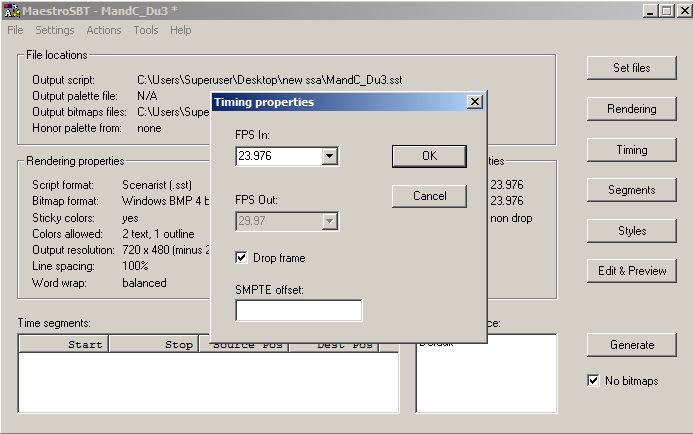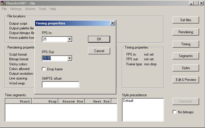 As I said, I do the retiming before ever getting to MaestroSBT. Your way should work, if both DVD sources have exactly the same number of frames. Otherwise, you'll need either SubStationAlpha or Aegisub (or other programs if you're willing to convert to SRT and then later on back to SSA for MaestroSBT) to check out the timing as compared to the audio or a video file of the movie.The new subtitles are from a 25fps source and they will be re-timed to suit.