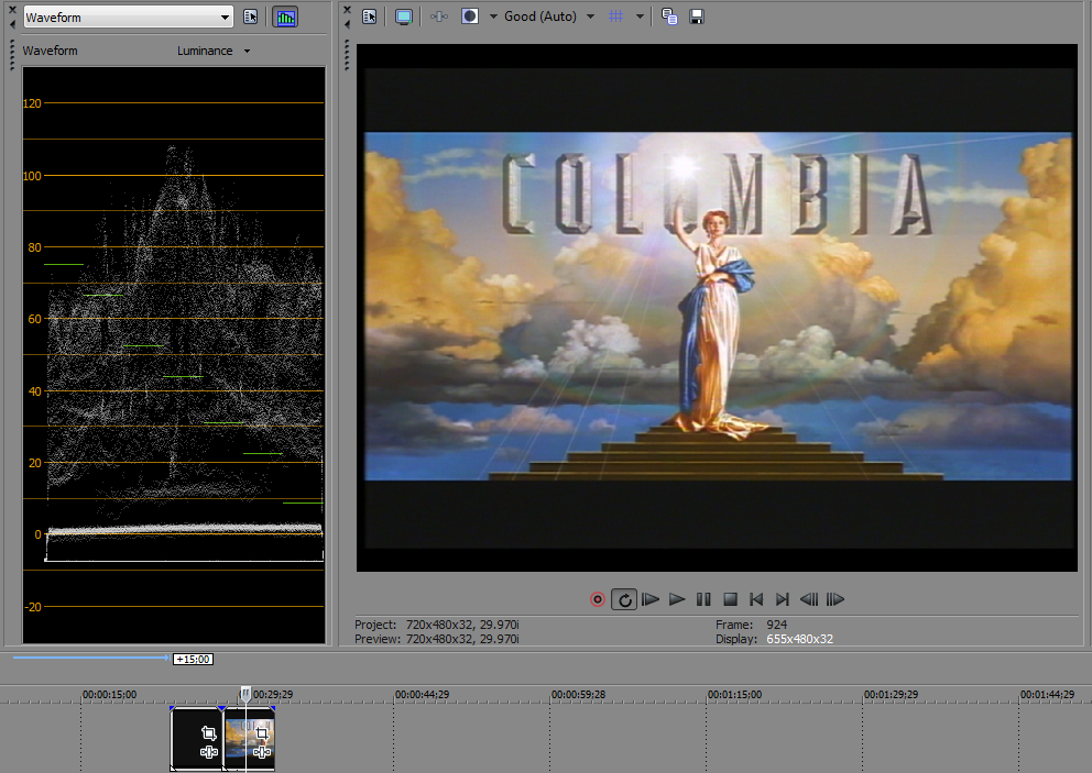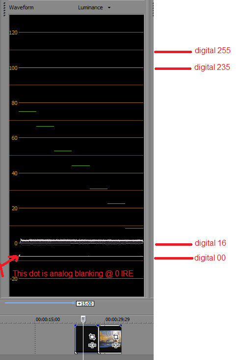 This the first time I saw this thread so I pulled your screen caps to the Vegas timeline. The black frame shows about +2 % hot black. The "Columbia" slide was similar if you average out the noise. It also was mildly clipping at 108% (digital 255).