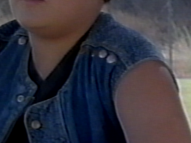 The original park bench scene looks washed out because the VCR's contrast range is so anemic. At the same time, red and blue look oversaturated; they tend to pop off the screen. The kid on the right has pale-looking blue arms. If you increase saturation and contrast to get a more natural look, those two colors look even worse. The image on the left of the kid in denim looks horrible. There's chroma nosie everywhere in red and blue. ANd here';s a closeup of what that VCR does to shadows (it did the same thing to the earlier 20120323000633703.avi). This edited frame is enlarged 2X with bicubic resize: