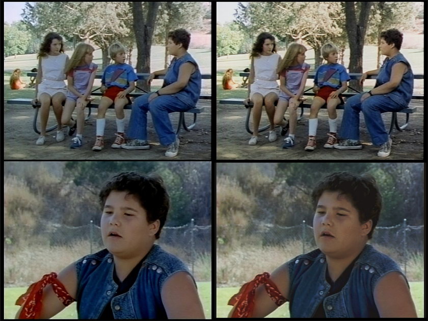 Note the lower-left image in the lower group of frames. The kids is too blue, but the major problem is that his hair is a purplish-black blob instead of a lighter color (his hair looks dark brown in other shots). His t-shirt looks blacked-out but is navy blue in other shots.Had to play with levels and color in YUV before trying to tweak these close-ups of him. Visually these shots of the kid don't look like the other shots -- very common with VHS. Dont'cha just love it?