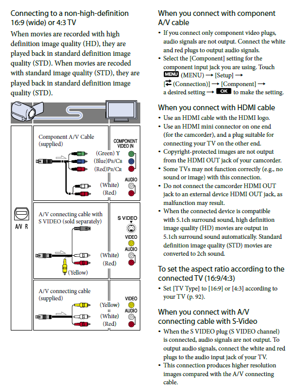 the only outputs I can find is the AV output, HDMI (worthless) , and USB. I have no idea where a S-vid or component outputs would be. I looked pretty good. I read the specs and it does say component and s-vid.. I cannot find any way to hook a s-vid or component cables up. any idea how to do this?