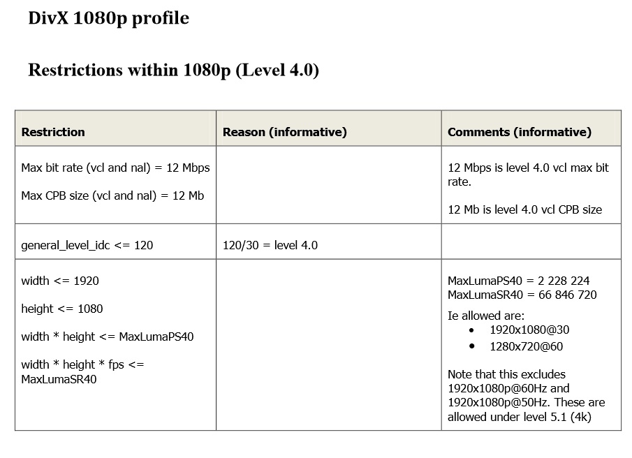 and looking at these restrictions 1080p encodes are not limited to 30fps.The 4K profile targets CE devices supporting 4K display resolutions up to 60 fps.