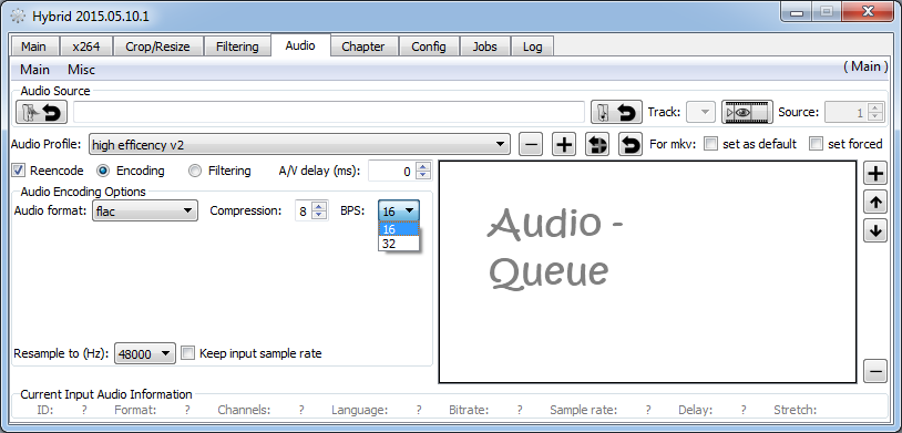 I have problems with the lack of 24bit option for flac audio compression. I've a lot of HD materials with 24bit audio. There are only two options in Hybrid: 16bit and 32bit