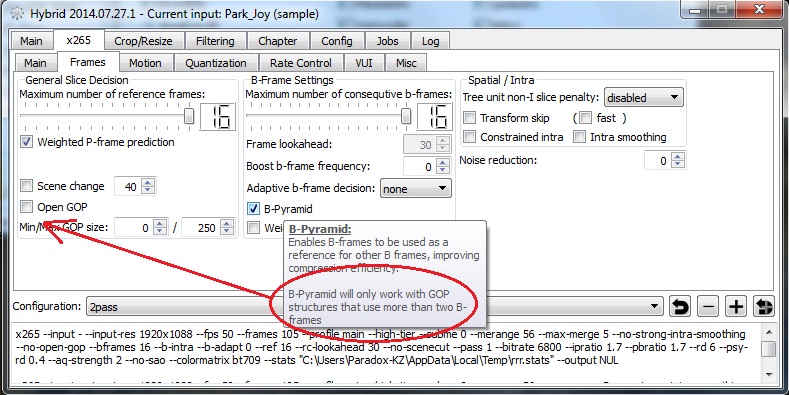And before you start fanatically to search for a case where Hybrid doesn't disable b-pyramid when it would make sense I tell you one (which Hybrid knowingly ignores): '--no-open-gop' + '--b-frames 1' + '--keyint 3' would not allow for two b-frames to be inside a gop and in such a case 'b-pyramid' wouldn't be possible and Hybrid ignores this case, since it's simply ridiculous to use such restrictions.