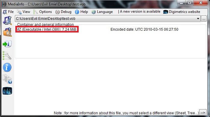 So I guess that, sooner or later, Kostya @ multimediawiki.cx will break such an amateurish "copy protection"Code:Last message repeated 77 times [mpeg @ 0216A540] probed stream 2 failed [mpeg @ 0216A540] Could not find codec parameters (Video: none) Last message repeated 1 times [NULL @ 0226F8C0] start time is not set in estimate_timings_from_pts Input #0, mpeg, from 'test.vob': Duration: 00:00:07.16, start: 600.000000, bitrate: 8483 kb/s Stream #0:0[0x1c7]: Audio: mp1, 48000 Hz, mono, s16, 96 kb/s Stream #0:1[0x1eb]: Video: none, 90k tbr, 90k tbn Stream #0:2[0x1e0]: Video: none, 25 tbr, 90k tbn