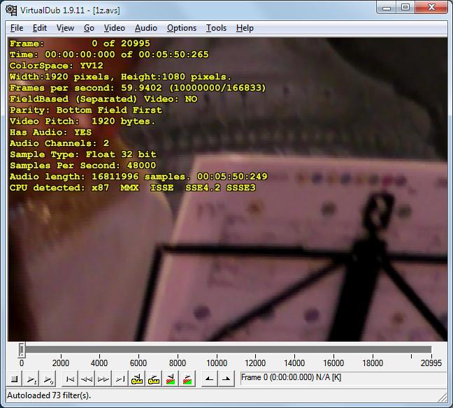 As poisondeathray pointed out, DirectShow is Windows' A/V subsystem. Using DirectShowSource() is asking Windows to open and decompress the video file for you (as opposed to something like AviSource() where AviSynth itself opens the file, splits the video and audio into separate streams, and decompresses them using installed VFW codecs). Exactly what combination of filters is used will depend on what you have installed on your system. At the start of this thread I was using LAV Filters. But later I switched back to Haali and ffdshow to see if there was any improvement. There wasn't much difference as far as this video was concerned. I also tried using the old version of ffms2 which screwed op some of the feilds/frames, and a newer version which locked up completely. I also tried using Core AVC as the decoder.Last edited by jagabo; 3rd May 2012 at 21:09.