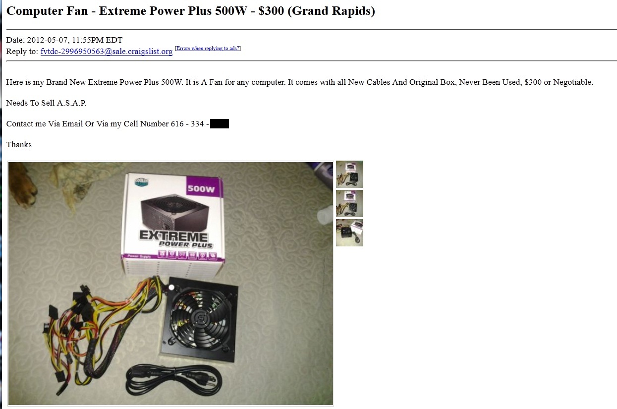 LMAO!!!Hi. The power supply is for $300 on craigslist. The lowest i can go is $250 but it is brand new never been open or used. So i am looking for $300 but are you still interested?? Call me on my cell. 616 334 xxxx. Thanks daniel.