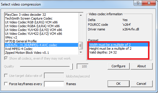 whenever I choose ffdshow video codec to compress the video on virtualdub, it always shows an error "unable to initialize the output codec. check that the video codec is compatible with the output video frame size and that the settings are correct". I'm really new to this program so I don't know how to deal with it.......can anyone tell me what to do??
