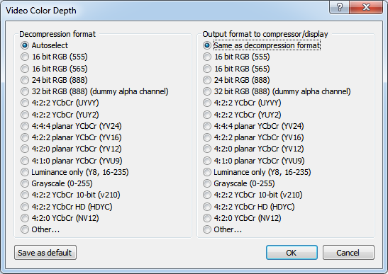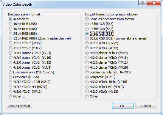 I just checked (ran VirtualDub on a fresh XP install) and you are right. I thought the default Color Depth settings were this:
