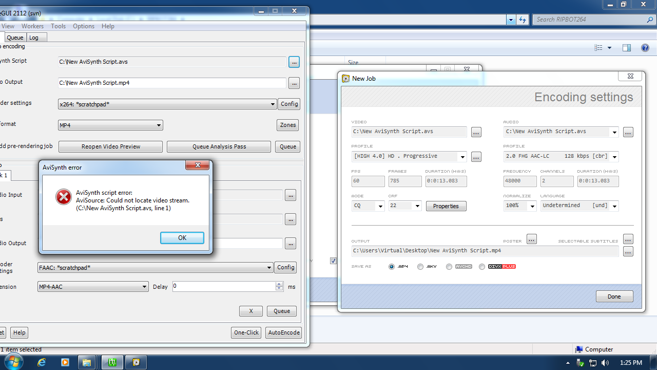 3. I don't normally use MeGUI but I have it. I tried opening an AVS script that opened an AVI file. It worked fine for that. But when I tried to open an AVS script that opened from VirtualDub's frameserver it didn't work and gave the error you originally reported: