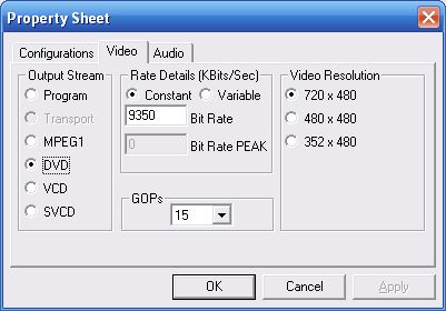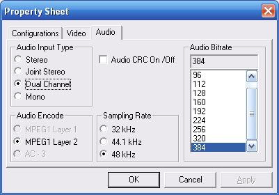 When trying to capture video, I had to set the audio setting to "dual channel". That way the recorded video plays back from both speakers. If I leave the setting on "joint stereo" or "stereo" or "mono", the audio only plays back from the left speaker.I set the video capture output stream to "DVD" at 9350kbps constant, and the audio to MPEG1 Layer 2 at 48kHz and 384kbps (there is no way to change the audio to AC3 or MPEG Layer 1 in WinTV). I want to get the best possible video quality, but I dunno about what setting to put for sound... is the one I have too high? That is my first question.